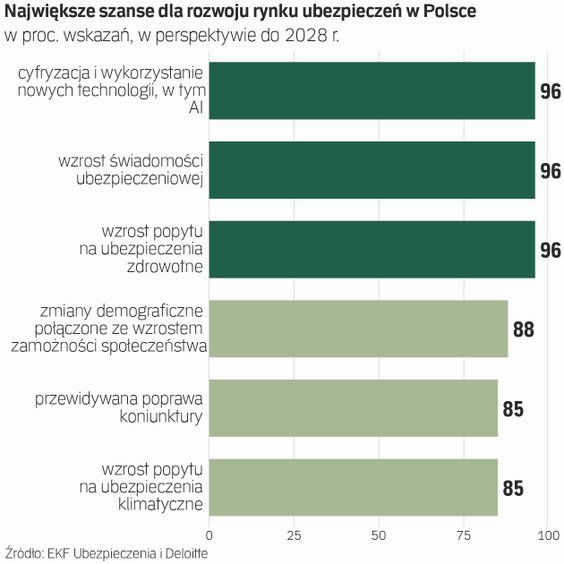 Wśród dziesięciu najważniejszych szans rozwojowych dla rynku ubezpieczeń w Polsce badani wskazali zarówno czynniki technologiczne, jak i gospodarcze oraz społeczne, które w nadchodzących latach mogą znacząco wpływać na dynamikę zmian w branży.