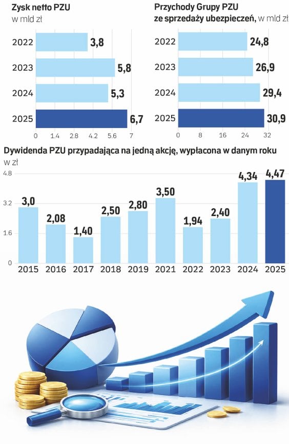 Przychody brutto Grupy PZU ze sprzedaży ubezpieczeń sięgnęły w minionym roku rekordowych 30,9 mld zł i były o 1,5 mld zł, czyli o 5 proc., wyższe niż rok wcześniej. Zysk netto dla akcjonariuszy PZU sięgnął w 2025 r. także rekordowych 6,7 mld zł, co oznacza wzrost o 25,4 proc. względem 2024 r.