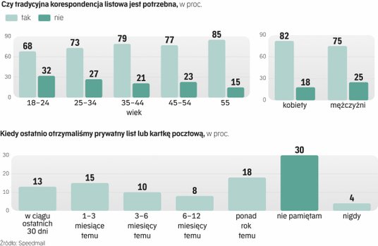 Badanie zlecone przez Speedmail, alternatywnego operatora pocztowego względem lidera – Poczty Polskiej (PP), którego wyniki "Rzeczpospolita" publikuje jako pierwsza, pokazuje, że papierową korespondencję najczęściej wysyłają nam urzędy (48 proc.), banki (36 proc.), administratorzy budynków mieszkalnych (30 proc.) oraz operatorzy telekomunikacyjni (20 proc.). Wśród nadawców rzadko już widzimy rodzinę czy znajomych. W przypadku prywatnych listów tzw. e-substytucja zrobiła już swoje. Tylko 14 proc. Polaków przyznaje, że jeszcze czasem znajdzie w skrzynce kopertę z listem czy pocztówkę. Niemal jedna czwarta z nas (24 proc.) w perspektywie ostatnich pięciu lat w ogóle nie dostała takiej korespondencji.