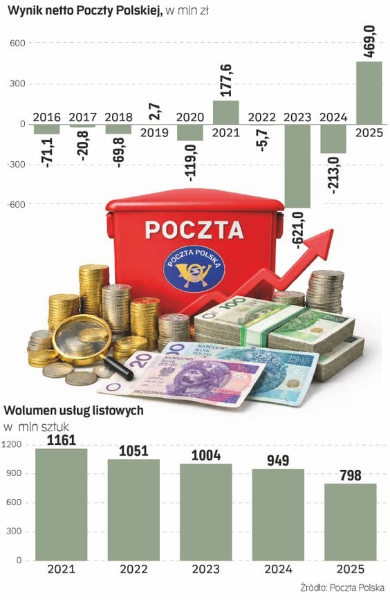 Poczta Polska walczy o przetrwanie. Tuż przed Świętami pokazała swoje wyniki za 2025 r. Pochwaliła się zyskiem netto w wysokości 469 mln zł wobec 213 mln zł straty w 2024 r. Przyznała, że pozytywnie na jej wynik netto wpłynęły dwie wysokie dotacje z tytułu finansowania kosztu netto świadczenia tzw. usług powszechnych za lata 2023 i 2024. – To pozwoliło na stabilizację płynności i zabezpieczenie części procesów inwestycyjnych – poinformował Sławomir Żurawski, wiceprezes Poczty Polskiej, który pełni obowiązki prezesa po tym, jak przed końcem kwietnia posadę tę stracił Sebastian Mikosz.
