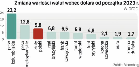 Nadzieje na gołębią politykę Fedu sprawiły, że bardzo wiele walut w poniedziałek było mocniejszych wobec dolara niż na początku roku. Najbardziej umocniła się od początku stycznia afgani, czyli waluta Afganistanu, która zyskała blisko 28 proc. wobec „zielonego”. Spośród bardziej płynnych walut największej aprecjacji doznało peso kolumbijskie, drożejąc o 23 proc. Na drugim miejscu uplasowało się peso meksykańskie, ze wzrostem prawie o 13 proc., a na trzecim nasz polski złoty, który zyskał niemal 10 proc. Umocnienie naszej waluty można tłumaczyć również reakcją inwestorów na wynik wyborów parlamentarnych. Dobrze radził też sobie forint, który zyskał prawie 6 proc.