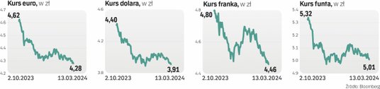 Marzec przyniósł kolejną falę umocnienia złotego. W tym tygodniu kurs euro do złotego obniżył się do 4,28 zł, osiągając najniższy poziom od ponad czterech lat. Wyraźny spadek zanotował także kurs franka szwajcarskiego, który zjechał do 4,46 zł, będąc najniżej od połowy 2022 r. Na dobrej drodze do przebicia grudniowego dołka 3,88 zł jest dolar. W wyniku kontynuacji umocnienia złotego za amerykańską walutę płacono ostatnio 3,91 zł.