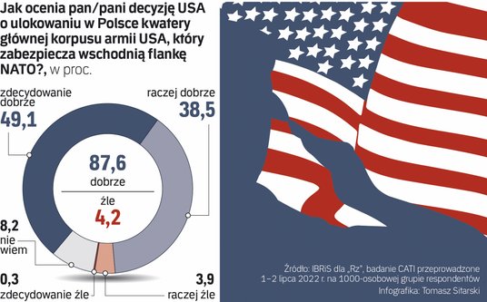 Tak wynika z badania przeprowadzonego przez IBRiS na zlecenie „Rzeczpospolitej”. Aż 87,6 proc. badanych dobrze ocenia decyzję USA o ulokowaniu w Polsce dowództwa korpusu armii amerykańskiej, który zabezpiecza wschodnią flankę NATO. Przeciwnego zdania jest ledwie 6,9 proc. respondentów, pozostali nie mają zdania.