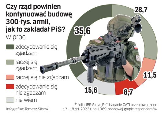 Tak wynika z badania IBRiS przeprowadzonego na zlecenie „Rzeczpospolitej”. Wynika z niego, że 64,3 proc. badanych zgadza się ze stwierdzeniem, że rząd powinien kontynuować tworzenie 300-tysięcznej armii. Przeciwnie myśli 20,2 proc. pytanych, a zdania nie ma 15,6 proc.