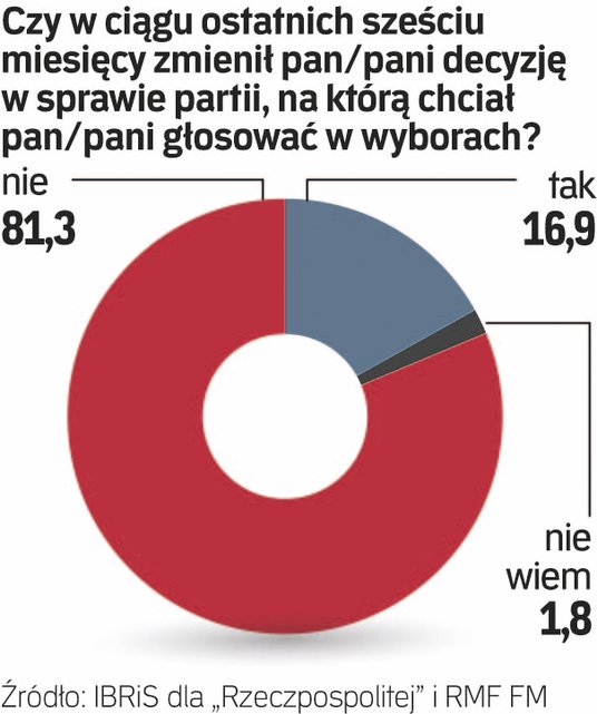 Według sondażu IBRiS dla „Rzeczpospolitej” i RMF FM zdecydowana większość wyborców nie daje się porwać partyjnym obietnicom i kampanijnym starciom. Ponad 80 proc. respondentów przez ostatnie sześć miesięcy nie zmieniło zdania co do tego, na kogo odda głos 15 października.