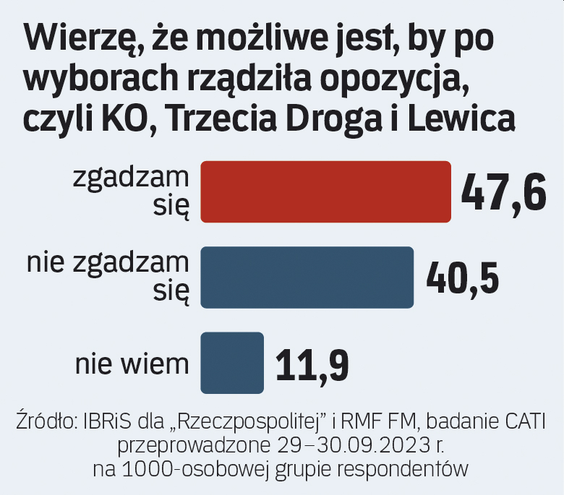 IBRIS na zlecenie „Rzeczpospolitej” i RMF FM zapytał respondentów, czy ich zdaniem „po wyborach rządy w Polsce powinna przejąć obecna opozycja, czyli Koalicja Obywatelska, Trzecia Droga i Lewica”.