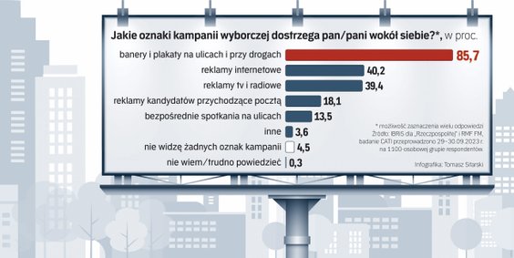 Na pytanie: „Jakie oznaki kampanii wyborczej dostrzega pan/pani wokół siebie?” (w sondażu była możliwość zaznaczania wielu odpowiedzi), aż 85,7 proc. wskazało „banery i plakaty na ulicach i przy drogach” (84 proc. wyborców obozu rządzącego, 90 proc. elektoratu opozycji, 87 proc. niezdecydowanych), na reklamę internetową wskazało 40,2 proc. ankietowanych (28 proc. wyborców PiS, 48 proc. opozycji, 18 proc. niezdecydowanych), reklamy telewizyjne i radiowe kandydatów na parlamentarzystów dostrzega 39,4 proc. badanych (58 proc. wyborców obozu rządzącego, 40 proc. elektoratu opozycji, 17 proc. niezdecydowanych), reklamy kandydatów przychodzące pocztą 18,1 proc. (12 proc. wyborców PiS, 16 proc. opozycji, 34 proc. niezdecydowanych), a na bezpośredni kontakt na ulicy z kandydatem na parlamentarzystę wskazało jedynie 13,5 proc. ankietowanych (15 proc. wyborców PiS, 17 proc. opozycji, 16 proc. niezdecydowanych). Co mówią nam te dane?