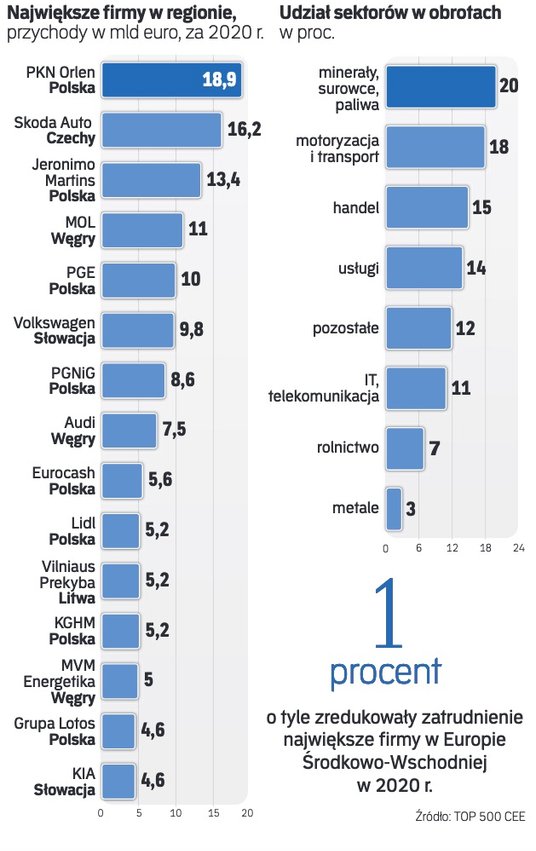 Liderem zestawienia niezmiennie PKN Orlen, wiodący gracz wśród przedsiębiorstw petrochemicznych w Europie Środkowo-Wschodniej. W pierwszej dziesiątce znalazły się też Jeronimo Martins Polska, Polska Grupa Energetyczna, PGNiG, Eurocash oraz Lidl. Największymi pracodawcami w regionie też są firmy znad Wisły: Poczta Polska (79 tys. pracowników) oraz wspomniane już Jeronimo Martins (70 tys.).