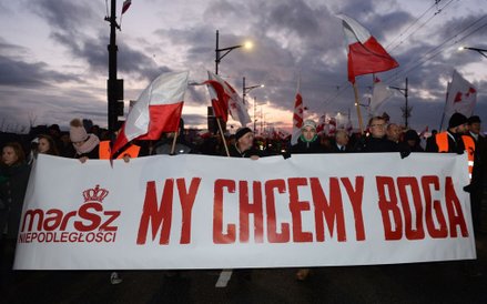 Tegoroczny Marsz Niepodległości odbywa się pod hasłem "My chcemy Boga". Na transparentach widać też jednak inne slogany - w oczy rzuca się duży transparent z napisem "Śmierć wrogom ojczyzny".
