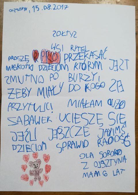 Sześcioletnia Ola z Olsztyna napisała list do sołtysa wsi Rytel, w którym prosi o przekazanie jej maskotek dzieciom, których rodziny ucierpiały w czasie nawałnic jakie przechodziły nad Polską w ubiegły weekend.