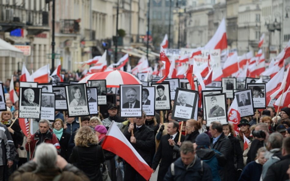 Ulicami Warszawy idzie marsz z portretami ofiar katastrofy smoleńskiej.