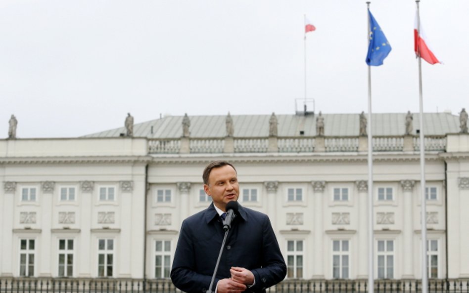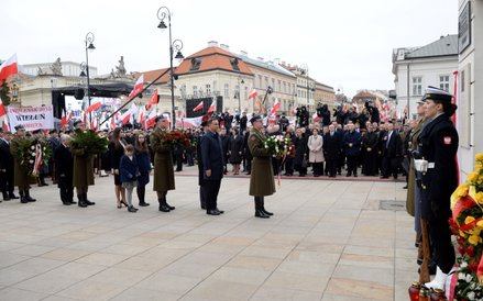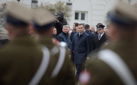 Uroczystości przed Pałacem Prezydenckim. Uczestnicy śpiewają hymn Polski. Za chwilę przemówi prezydent Andrzej Duda.