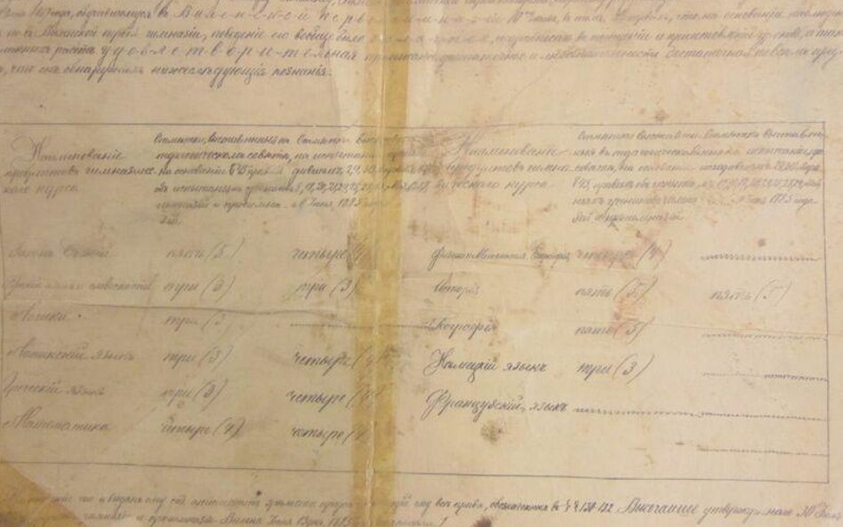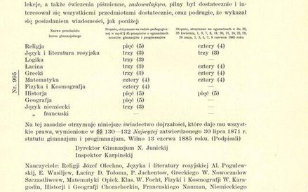 „Świadectwo niniejsze otrzymuje uczeń klasy VIII Piłsudski Józef-Klemens wyznania rzymsko-katolickiego, szlachcic (...) który pobierał nauki w pierwszem gimnazjum Wilenskiem przez 10 lat (...) sprawował się wzorowo, uczęszczał do szkoły i odrabiał lekcje, a także ćwiczenia piśmienne, zadawalająco, pilny był dostatecznie i interesował się wszystkiemi przedmiotami dostatecznie" (pisownia oryginalna – red.).