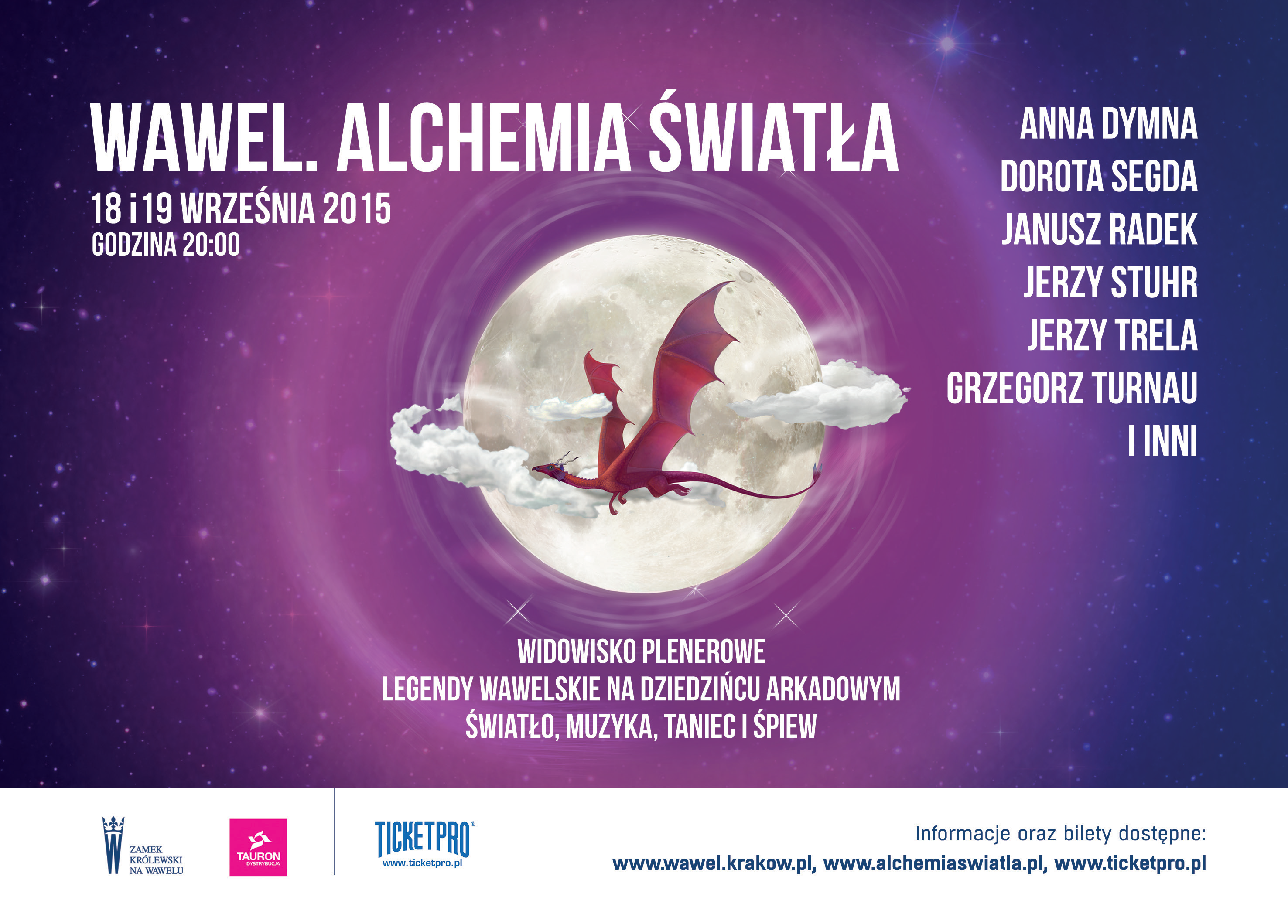 Wszyscy, którzy 18 lub 19 września 2015 o godzinie 20.00 wybiorą się na wawelskie wzgórze w Krakowie mogą stać się uczestnikami wyjątkowego multimedialnego wydarzenia. Wawel. Alchemia światła to spektakl, w którym za sprawą innowacyjnej formy, wykorzystującej m.in. visual art i 3D mapping, w scenerii dziedzińca arkadowego ożyją wawelskie legendy. Będzie to swoista synteza sztuk, łącząca muzykę na żywo, malarstwo i trójwymiarowe obrazy, taniec, śpiew oraz słowo. W widowisku wezmą udział wybitni artyści: aktorzy, tancerze, muzycy, wspierani przez specjalistów z dziedziny multimediów i światła.