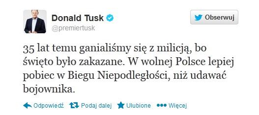 Premier Donald Tusk na Twitterze o swoim udziale w Biegu Niepodległości