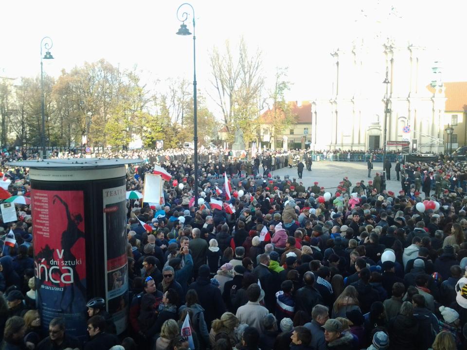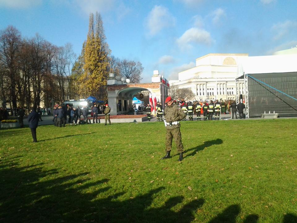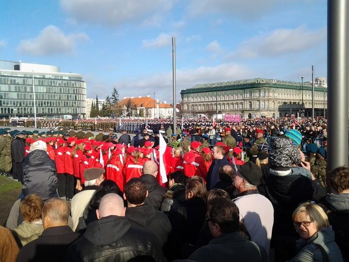 Na placu Piłsudskiego trwa defilada wojskowa. W rytm orkiestry wojskowej maszerują żołnierze z różnych formacji, za nimi idą grupy rekonstrukcyjne. Ulica Królewska została zamknięta. Żandarmeria Wojskowa formuje szyk, niebawem z tego miejsca ruszy marsz prezydencki "Razem dla Niepodległej". Oprócz pary prezydenckiej weźmie w niej udział m.in. Ewa Kopacz, marszałek Sejmu, Bogdan Borusewicz, marszałek Senatu i szef Sztabu Generalnego gen. Mieczysław Gocuł.