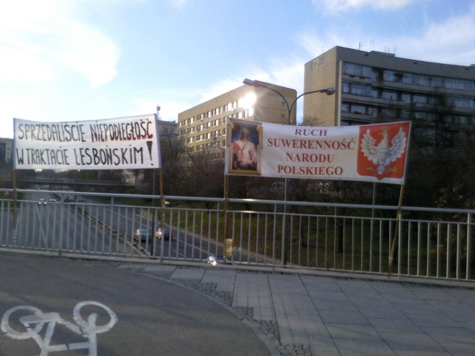 "Chwała bohaterom, obrońcą Ojczyzny. Hańba zdrajcom, sprzedającym Polskę" - kilka osób stoi z takim transparentem na wysokości ul. Mysiej, w pobliżu budynku PAP.