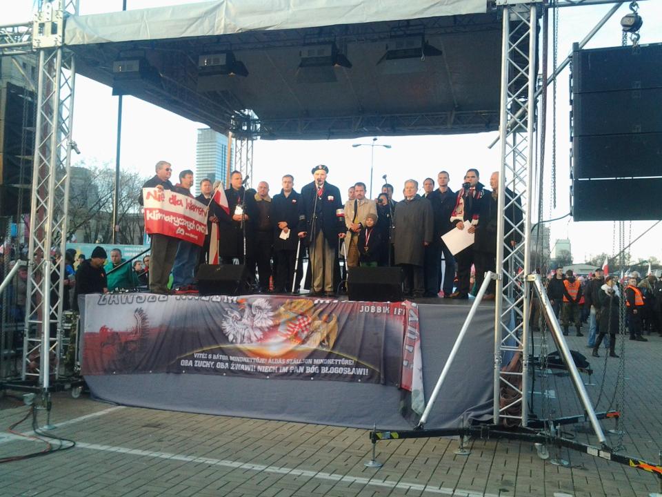 Na scenie pod Pałacem Kultury, gdzie rozpoczął się Marsz Niepodległości przemawiają przedstawiciele stronnictw narodowych m.in. były senator Ryszard Bender.