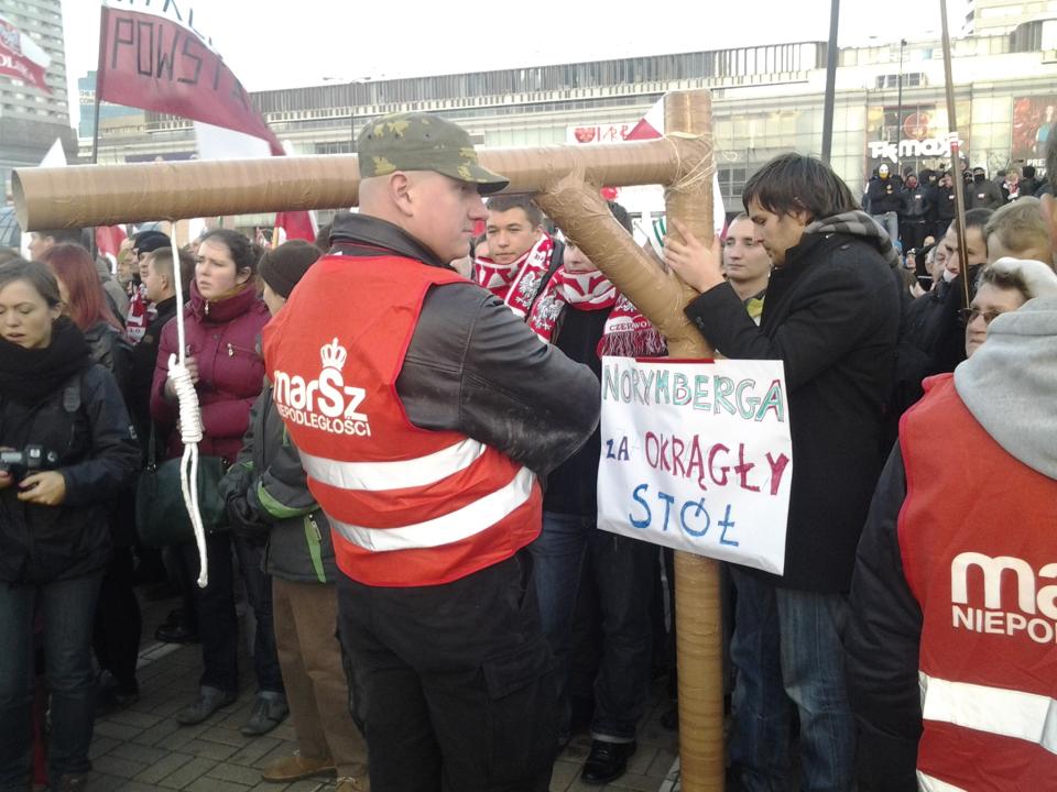 Uczestnicy Marszu Niepodległości niosą szubienicę zrobioną z tektury z napisem "Norymberga za okrągły stół".