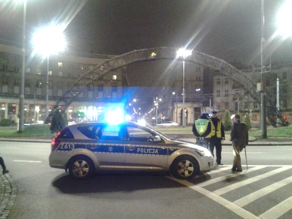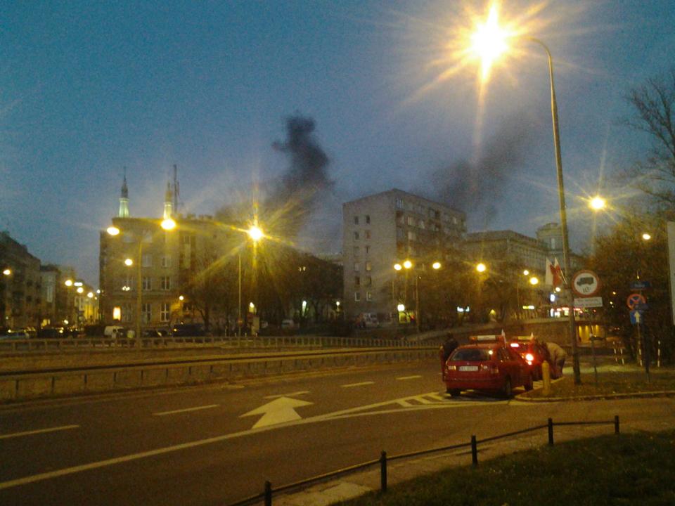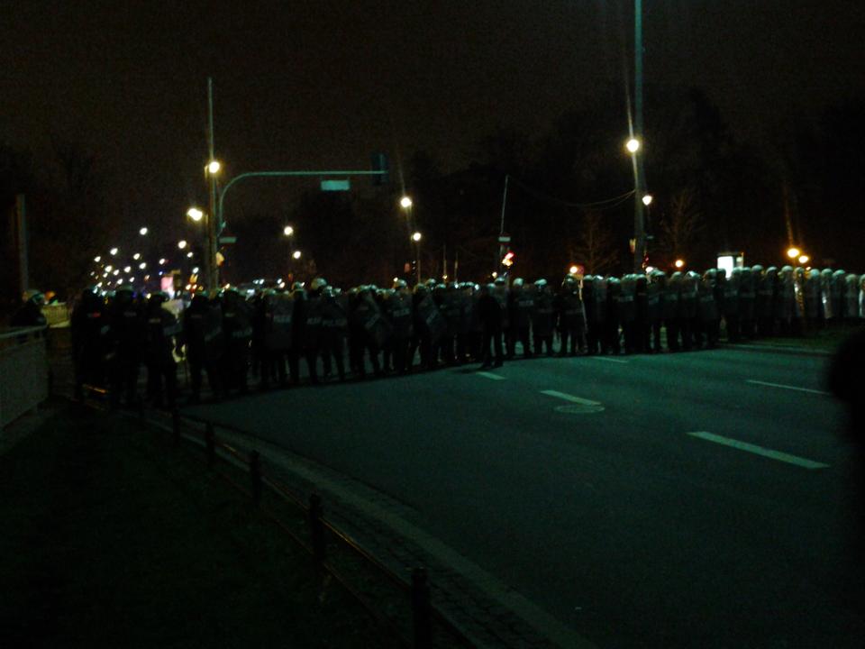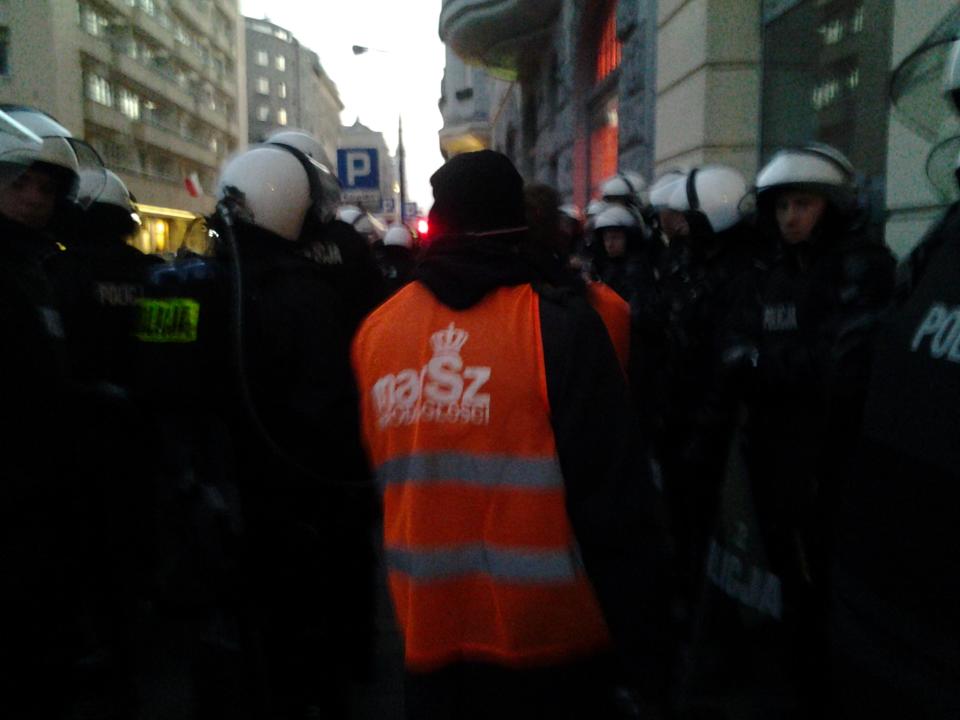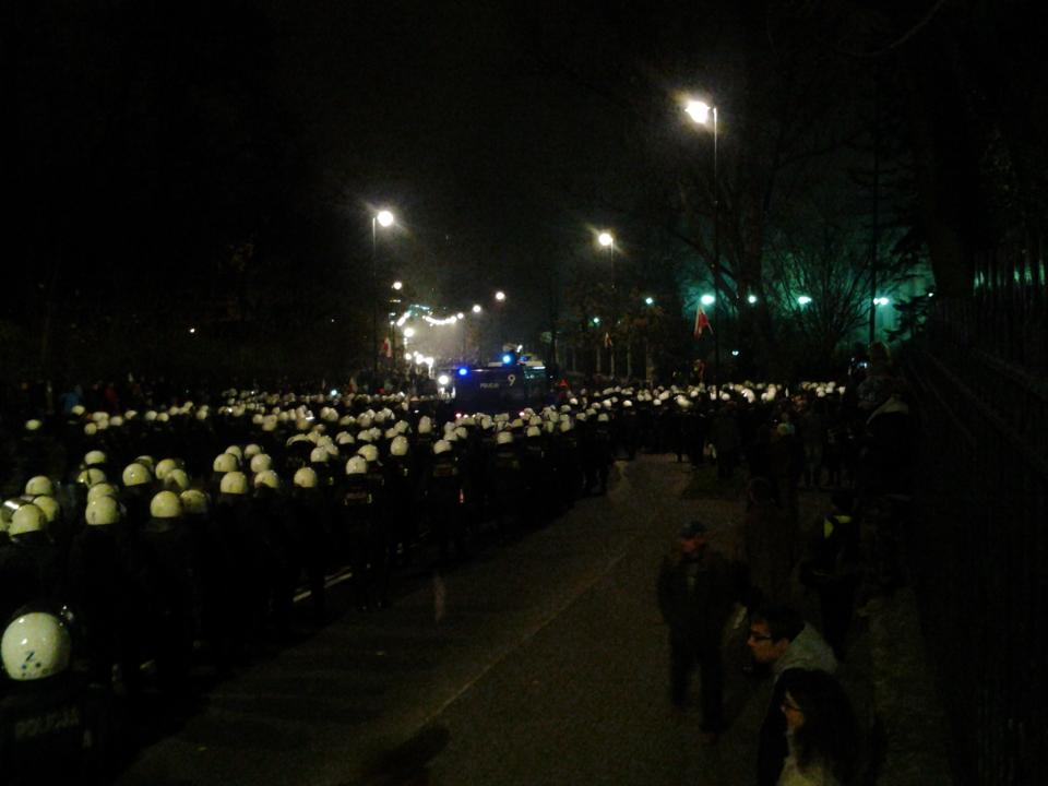 Uczestnicy marszu zatrzymali się na pl. na Rozdrożu. Większość z nich zachowuje się spokojnie, jednak grupki zamaskowanych mężczyzn wdają się w przepychanki z policją. Jedna z nich pobiegła w stronę al. Szucha.