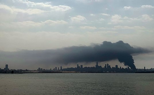 Nad portem i jego okolicami w Bejrucie unoszą się kłęby czarnego dymu. W akcji gaśniczej biorą udział śmigłowce.