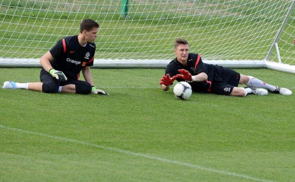 Wojciech Szczęsny i Przemysław Tytoń na treningu. Fot. AFP