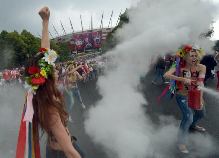 W okolicach Stadionu Narodowego w Warszawie dwie członkinie ukraińskiej grupy feministycznej Femen zdjęły koszulki i zaczęły wykrzykiwać hasła, m.in. "F**k Euro". Zostały bardzo szybko otoczone przez stewardów, a po chwili przejęte przez policję. Czytaj więcej