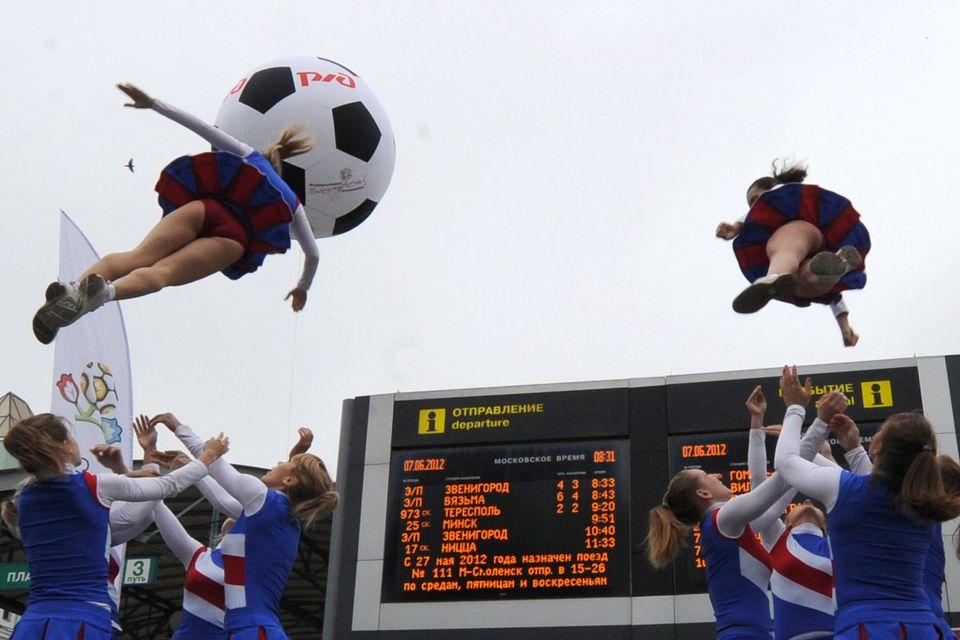 Występ rosyjskich cheerleaderek towarzyszył wyjazdowi do Polski kibiców "Sbornej" z Dworca Białoruskiego w Moskwie. Fot. AFP