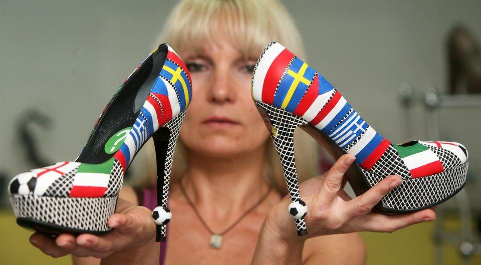 "Eurobuty" zaprojektowane przez Igora Zajcewa, ozdobione flagami uczestników mistrzostw, są do kupienia w Doniecku. Fot. AFP
