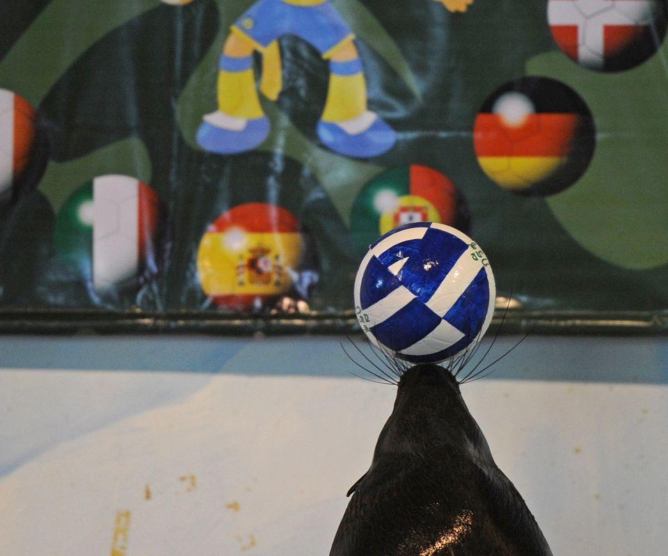 Impreza promująca Euro 2012 odbyła się nawet w Tajlandii, w zoo w Bangkoku. Nie udało nam się ustalić, dlaczego foka podbija piłkę ozdobioną akurat grecką flagą. Fot. AFP