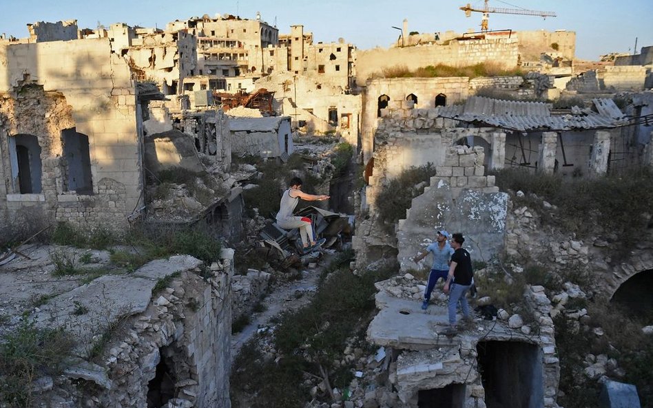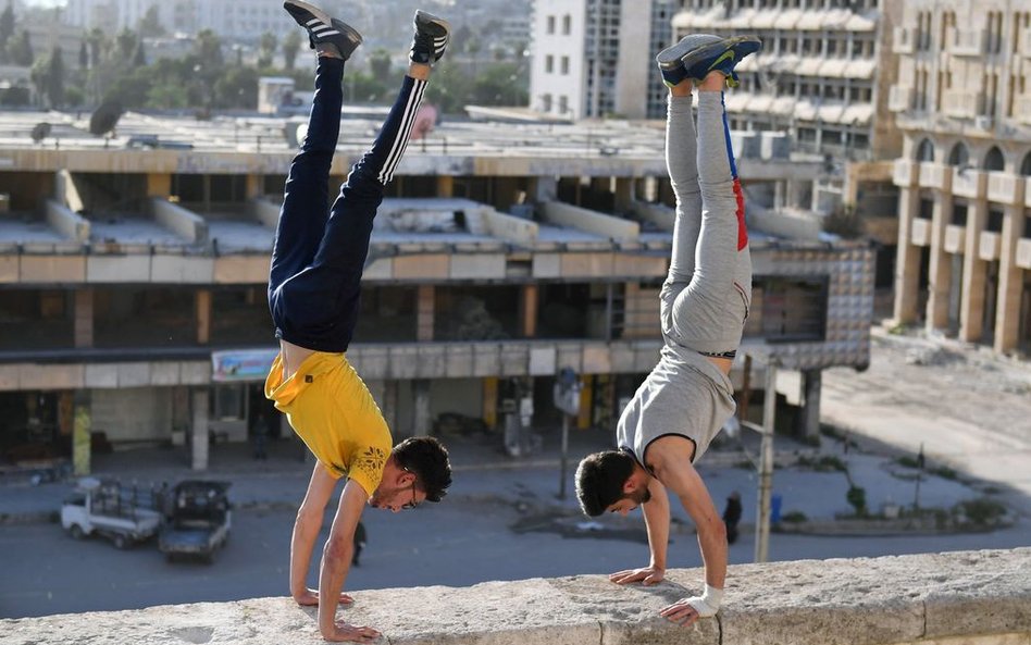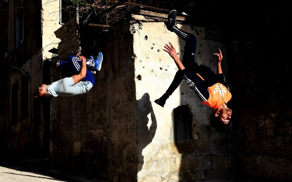 Młodzi Syryjczycy ćwiczą parkour w ruinach Aleppo.