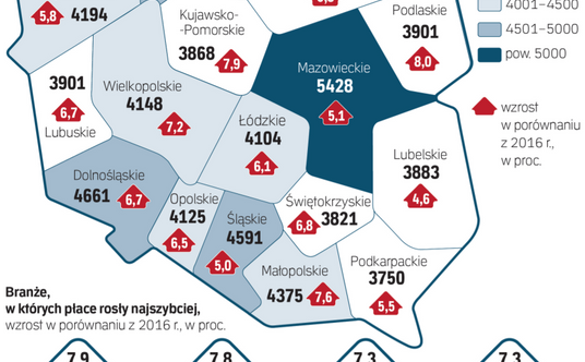 Podobnie może być w większości podlaskich firm, bo to właśnie to województwo okazało się liderem wzrostu płac w sektorze przedsiębiorstw. W całym 2017 r. średnie wynagrodzenie było aż o 8 proc. wyższe niż w w 2016 r. (przeciętnie w kraju wzrost wyniósł 5,9 proc.), a w samym grudniu 2017 r. – o ponad 10 proc. więcej niż rok wcześniej (średnio w kraju – 7,3 proc.).