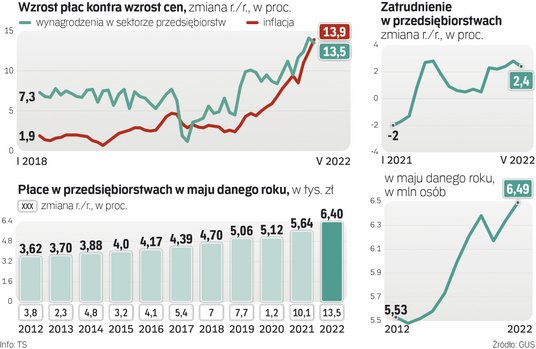 Przeciętne płace w sektorze przedsiębiorstw wciąż dynamicznie rosną, w maju były o 13,5 proc. wyższe niż rok wcześniej – podał GUS w poniedziałek. Ale jeśli te podwyżki porównać do wzrostu cen, który w maju wyniósł aż 13,9 proc., to okazuje się, że wynagrodzenia w firmach realnie spadły (jak wylicza GUS) o 0,3 proc. Inaczej mówiąc, przestały one nadążać za inflacją.