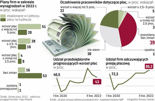 To wciąż bardzo wysoki odsetek pracodawców, którzy są skłonni jakoś rekompensować pracownikom rosnące koszty życia. Jednak w pierwszym półroczu tego roku aż 83 proc. firm dokonało podwyżek wynagrodzeń (w tym 51 proc. o ponad 5 proc.). W tym czasie tylko 16 proc. organizacji nie zmieniło oferowanych płac, a obecnie takie plany ma już ponad 50 proc.