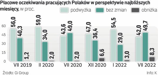 Łącznie 42 proc. ankietowanych spodziewa się jeszcze w najbliższych miesiącach wzrostu wynagrodzenia. To sporo mniej niż na początku roku, a nawet mniej niż latem 2020 r. (czyli w trudnym roku pandemii). Również wcześniej, w letnich falach badania, oczekiwania podwyżkowe przekraczały 56 proc.
