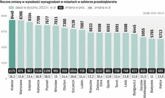 W większości pozostałych miast przeciętna płaca wynosiła od 6 tys. zł do ponad 7 tys. zł brutto. W dwóch: Kielcach i w Białymstoku – poniżej 6 tys. zł brutto.