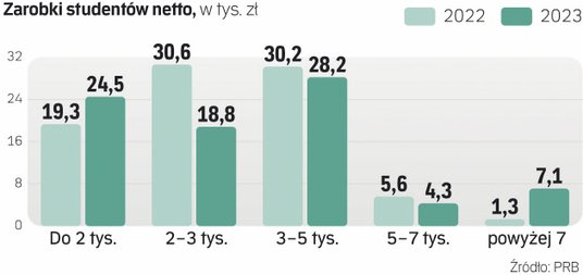Jednocześnie wyraźnie wzrósł odsetek pracujących studentów (z 6,9 do 11,4 proc.), którzy zarabiają powyżej średniej płacy w Polsce, czyli ponad 5 tys. zł netto. Z kolei udział osób deklarujących zarobki netto powyżej 7 tys. miesięcznie zwiększył się z 1,3 do 7,1 proc. W rezultacie mediana studenckich zarobków netto jest obecnie w przedziale 3–4 tys. zł netto, czyli o tysiąc złotych więcej niż w ub.r. (2–3 tys. zł).