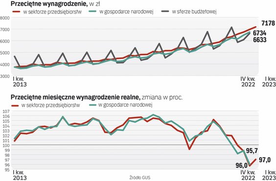 Informacje GUS o wynagrodzeniach w sektorze przedsiębiorstw często skrótowo są określane jako o informacje o „przeciętnych” zarobkach. Jest to jednak zbyt duży skrót myślowy, ponieważ znacząca część pracowników ma niższe pensje. Informacje z GUS dotyczą bowiem płac w firmach, w których – licząc w etatach – pracuje powyżej dziesięciu osób. W I kwartale przeciętnie w takich firmach pracowało w sumie 6,5 mln osób, podczas gdy w gospodarce pracownikami pod koniec ub.r. było ok. 13,5 mln osób. W tej grupie nie ma też zatrudnionych w sektorze publicznym (urzędników, nauczycieli, lekarzy), rolników oraz samozatrudnionych czy pracujących w mikrofirmach.