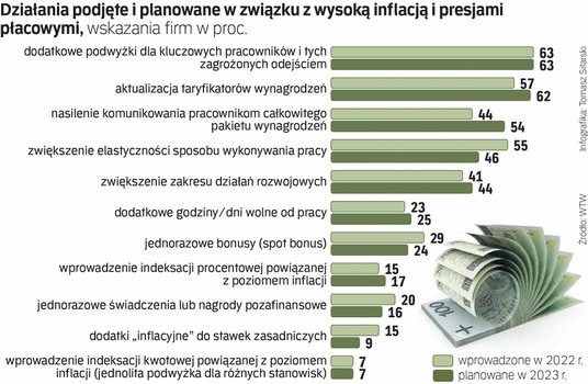 Najczęściej (63 proc. firm) wprowadzają dodatkowe podwyżki dla kluczowych pracowników. Spora grupa będzie też aktualizować taryfikatory płacowe i zwracać uwagę pracowników na wartość całkowitego pakietu wynagrodzeń (wraz z benefitami).