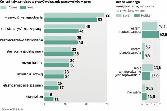 Prawie 63 proc. pracowników na świecie, w tym 72 proc. w Polsce, na pytanie o to, co jest dla nich najważniejsze w pracy, wskazują wynagrodzenie – dowodzi tegoroczna edycja globalnego raportu ADP „People at Work 2023: A Global Workforce View”. „Rzeczpospolita” jako pierwsza przedstawia raport, który podsumowuje wyniki badania opinii ponad 32,6 tys. pracowników z 17 krajów, w tym z Polski. I pokazuje, że wraz z szybkim wzrostem inflacji wszędzie wzrosło znaczenie finansowego aspektu pracy.