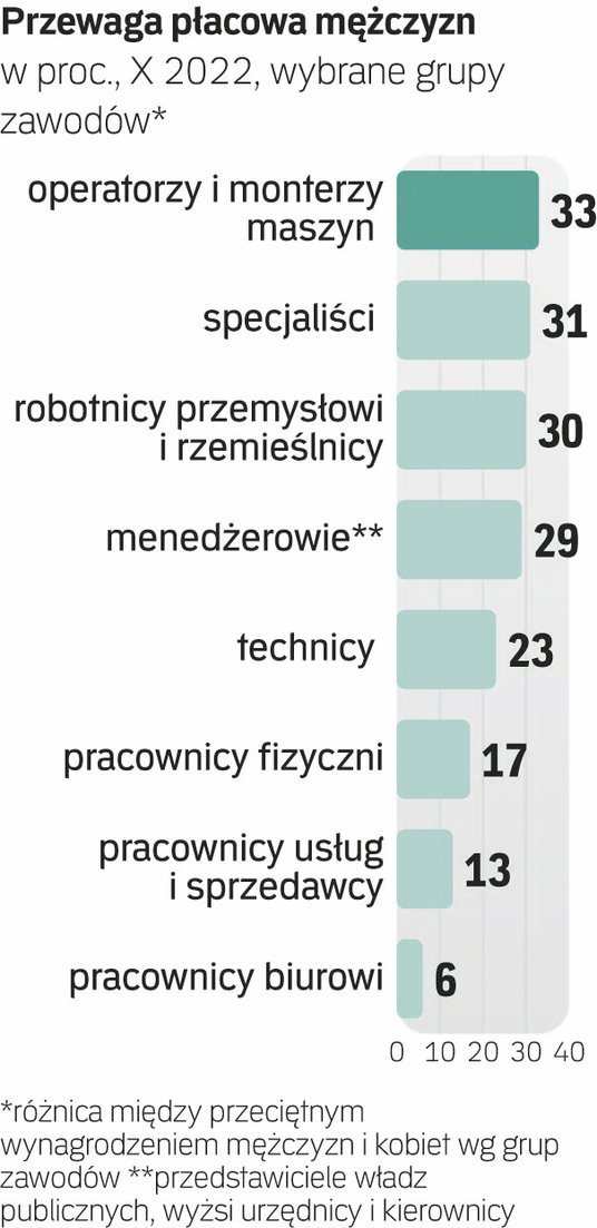 Raport, który bazuje na danych z października 2022 r., dowodzi, że przewaga płacowa mężczyzn jest widoczna niemal w każdej z dużych grup zawodowych (poza rolnictwem i leśnictwem, gdzie mediana wynagrodzenia jest wyższa u kobiet ). W finansach i ubezpieczeniach różnica na korzyść mężczyzn sięga 39 proc., w pozostałych usługach –38 proc., zaś w ICT – 34 proc.