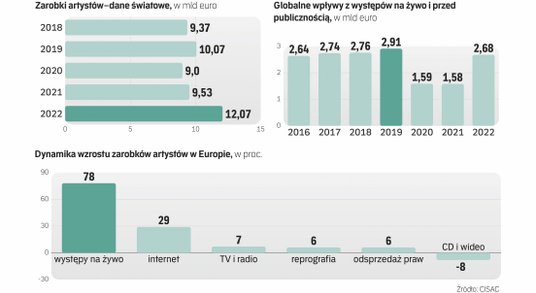 Międzynarodowa Konfederacja Związków Autorów i Kompozytorów (CISAC), zrzeszająca ponad 5 milionów twórców działających w branżach muzycznej, audiowizualnej, sztuki, literatury i teatru, wyliczyła, że globalna suma zysków artystów ze źródeł cyfrowych sięgnęła w ub.r. rekordowego pułapu 4,2 mld euro. Wydarzenia na żywo i wpływy ze sprzedaży egzemplarzy dzieł artystów, a także radio i telewizję przyniosły „zaledwie” 4 mld euro. To sytuacja bez precedensu, gdy obszar „digital” przebił tradycyjne formaty.