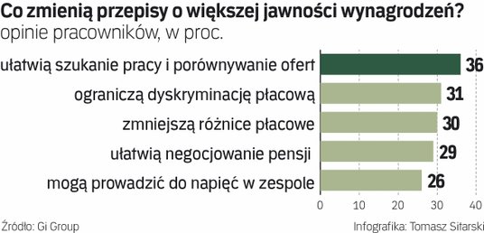 Niewiele mniej istotnym efektem przejrzystości wynagrodzeń będzie zapobieganie dyskryminacji płacowej, co znacznie częściej podkreślają kobiety (37 proc.) niż mężczyźni (26 proc.). Jak zaznacza Gi Group, panie dużo częściej dostrzegają w jawności wynagrodzeń sposób na wyrównanie szans. Podczas gdy 34 proc. kobiet podziela opinię, że nowe regulacje poprawią równość wynagrodzeń i zmniejszą różnice w płacach, to wśród mężczyzn jedynie co czwarty. Różnicy płci nie widać w ocenie, że większa jawność płac ujawni negocjowanie pensji z pracodawcą. Kobiety i mężczyźni niemal zgodnie przewidują też (co piąta badana osoba), że jednym z skutków jawności będzie wzrost zaufania między pracodawcami a pracownikami.