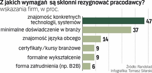 Pracodawców z tej grupy nie pytano o to, z jakich wymagań zrezygnowali, by zdobyć potrzebnych pracowników. Jednak biorąc pod uwagę ogół badanych, w pierwszej trójce kompromisów (poza znajomością wykorzystywanych w firmie narzędzi i systemów oraz doświadczeniem w branży) jest też znajomość języka obcego na określonym poziomie. W razie problemów ze zdobyciem kandydatów do pracy może z niej zrezygnować 14 proc. pracodawców, którzy rzadziej są (9 proc.) gotowi zaakceptować osobę bez wymaganych branżowych certyfikatów, zwłaszcza że w części zawodów ten brak uniemożliwia podjęcie pracy.
