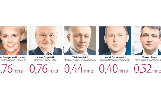 Przewodniczący Komisji Nadzoru Finansowego, zgodnie z niezmienionym od 2017 r. sposobem wynagradzania kierowniczych stanowisk państwowych, miał 33 tys. zł średniego miesięcznego wynagrodzenia, co dało niecałe 400 tys. zł przez rok. Większość przypadła Markowi Chrzanowskiemu, który pełnił tę funkcję do listopada (od grudnia jego następcą jest Jacek Jastrzębski). Podobną pensję miał Zdzisław Sokal, szef Bankowego Funduszu Gwarancyjnego – 440 tys. zł (2017 r.). Mniej zarobił w 2018 r. szef Polskiej Agencji Inwestycji i Handlu Tomasz Pisula (320 tys. zł). Pisula niedawno zrezygnował i p.o. prezesa PAIH jest teraz Krzysztof Senger. W przypadku Narodowego Banku Polskiego burza wokół wynagrodzeń dyrektorskich doprowadziła do uchwalenia w styczniu przez Sejm ustawy o jawności wynagrodzeń w banku centralnym. Z informacji z biura prasowego NBP wynika, że przeciętne miesięczne wynagrodzenie brutto prezesa Adama Glapińskiego (bazujące na oświadczeniu PIT) wynosiło w 2018 r. 63,5 tys. zł, czyli ok. 760 tys. zł rocznie.