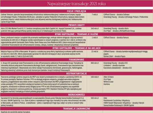 Kapituła przyglądała się największym transakcjom, zgłoszonym przez kancelarie biorące udział w naszym rankingu. Warunkiem rozpatrywania danej transakcji przez kapitułę było jej zakończenie w 2021 roku. Prace naszych ekspertów pozwoliły na wyłonienie po jednej najważniejszej transakcji z poszczególnych kategorii: fuzji i przejęć, private equity, rynków kapitałowych – transakcji dłużnych, rynków kapitałowych – transakcji na akcjach, finansowania, restrukturyzacji oraz nieruchomości.