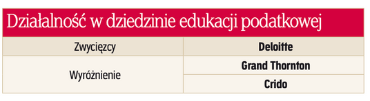 Trzeba przyznać, że aktywność firm na tym polu jest bardzo duża. Kapituła nie miała łatwego zadania. Po długich dyskusjach udało się wyłonić zwycięzcę. Jest nim firma Deloitte. Na członkach kapituły duże wrażenie zrobiło nietuzinkowe podejście firmy do edukacji przyszłych pokoleń doradców podatkowych. Deloitte organizuje dwa razy do roku Tax Venture. To ogólnopolski program płatnych praktyk w dziale doradztwa podatkowego, a do tego – dla wielu – zapewne ciekawa przygoda wprowadzająca w świat podatków. Firma poznaje talenty uczestników programu, a oni zespoły. Dodatkowo biorą udział w warsztatach merytorycznych, szkoleniach i innych aktywnościach. Dzięki temu mają szansę dowiedzieć się, który obszar doradztwa podatkowego jest im najbliższy.