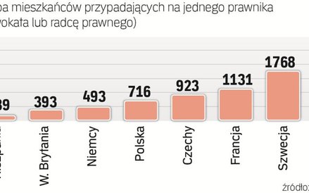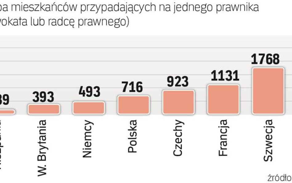 Adwokatów i radców prawnych jest w naszym kraju coraz więcej. Pod względem liczby prawników z uprawnieniami (adwokatów i radców prawnych) Polska awansowała z 18. na 13. miejsce w zestawieniu Rady Adwokatur i Stowarzyszeń Prawniczych Europy (CCBE). O ile w 2005 r. jeden wykwalifikowany prawnik przypadał w Polsce na 1253 obywateli, o tyle w 2015 r. – już na 716.