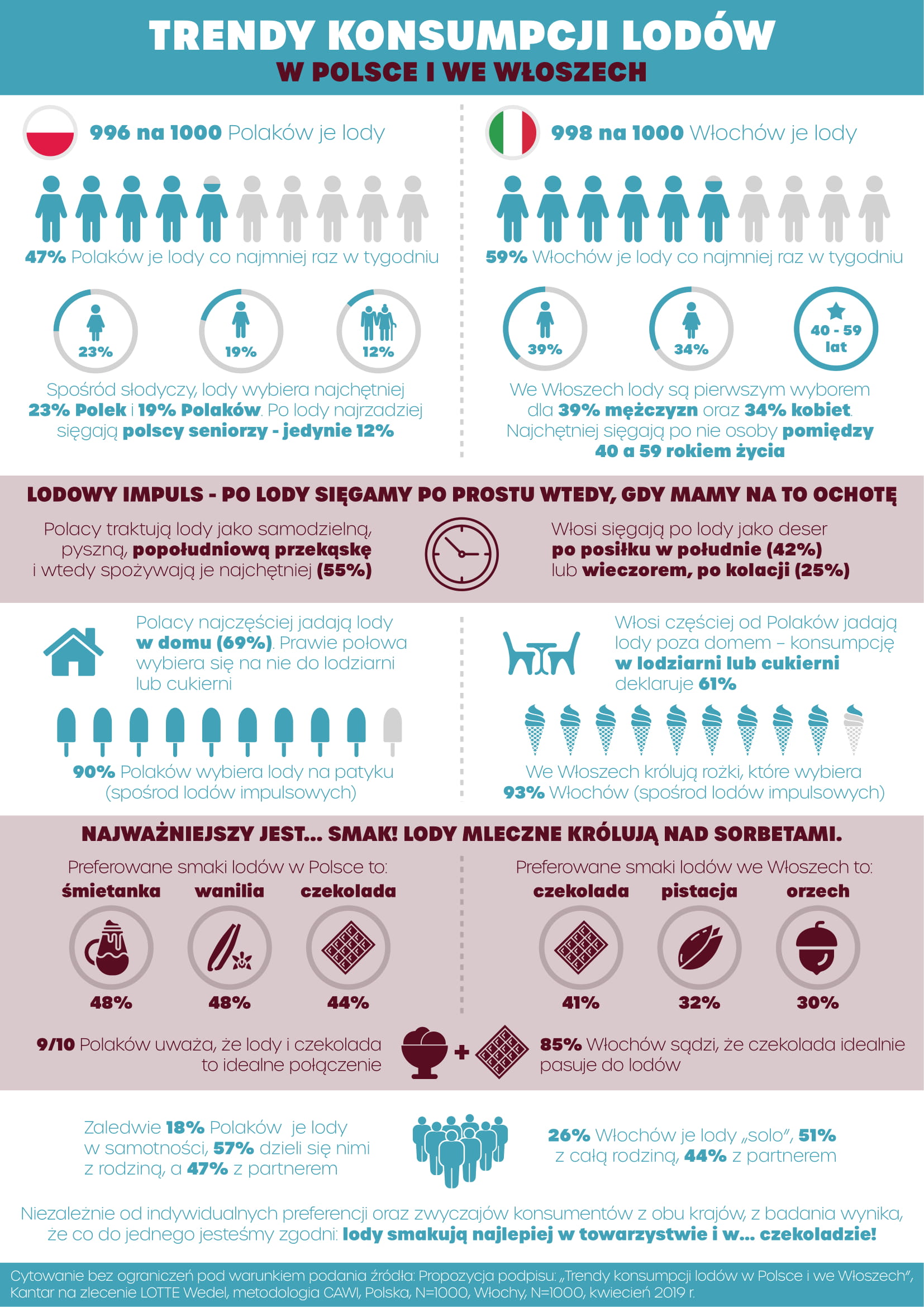 Jak pokazują badania, Polacy delektują się mroźnymi smakołykami przede wszystkim z rodziną (57 proc.) lub z partnerem (47 proc.). Mieszkańcy Włoch natomiast zdają się być w tej kwestii większymi indywidualistami – w pojedynkę lody konsumuje 26 proc. badanych (w Polsce 18 proc.).