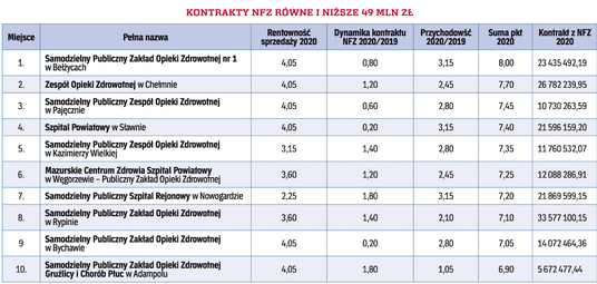 W kategorii placówek z kontraktem poniżej 49 mln zł zwycięża SPZOZ nr 1 im. Wojciecha Oczki w Bełżycach, miejscowości oddalonej o 35 km na południowy zachód od Lublina. Drugi na podium znalazł się Zespół Opieki Zdrowotnej w Chełmnie w województwie kujawsko-pomorskim, a trzeci – SPZOZ w Pajęcznie w Łódzkiem.
